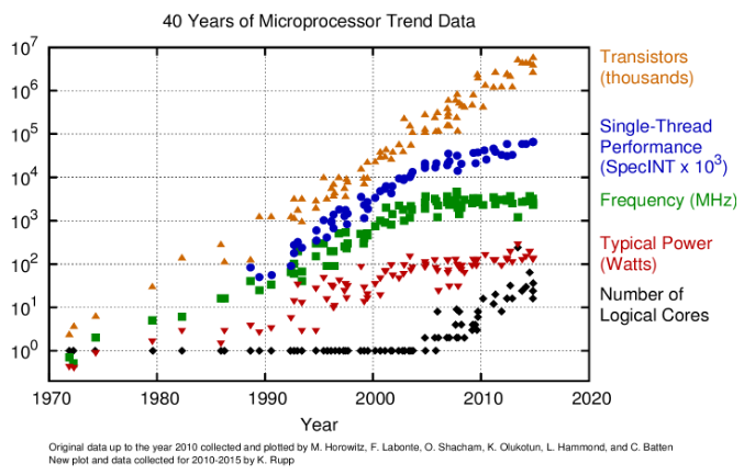 Hình 1: Dữ liệu xu hướng vi xử lý trong 40 năm. © Hình ảnh bởi K. Rupp thông qua karlrupp.net